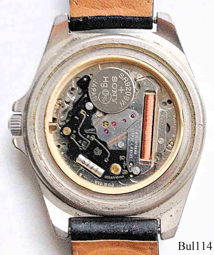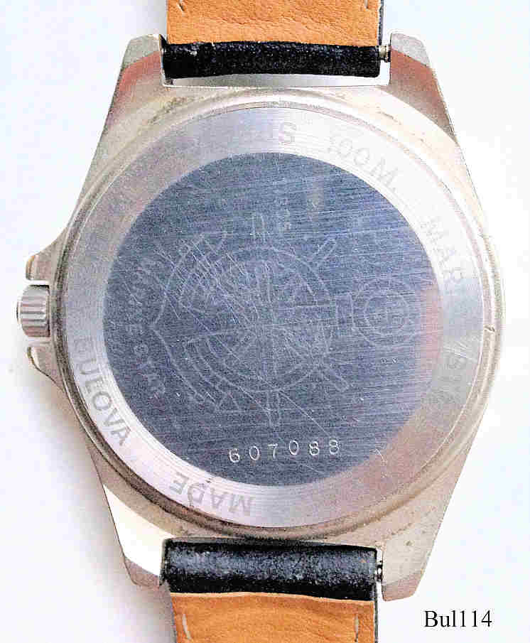 Eine Bulova Quartzuhr (kein Cronograph) Marine Star, Schwarzes Zifferblatt, goldene “Augen”. Anzeige bei 3: Datum, bei 6: Sekunde, bei 9: Tag. Beschriftet vorne: ”Bulova, Quartz, Marine Star”, hinten: “100 M, Marine Star, Special Made By Bulova, Swiss Made, 100 M, 11805, Marine Star” innen: ”Seven - 7 - Jewels, unadjusted, W. Germany, PUW 255”, Kaliber PUW 255.