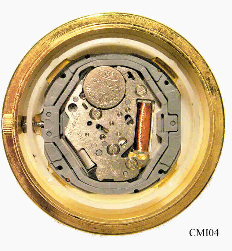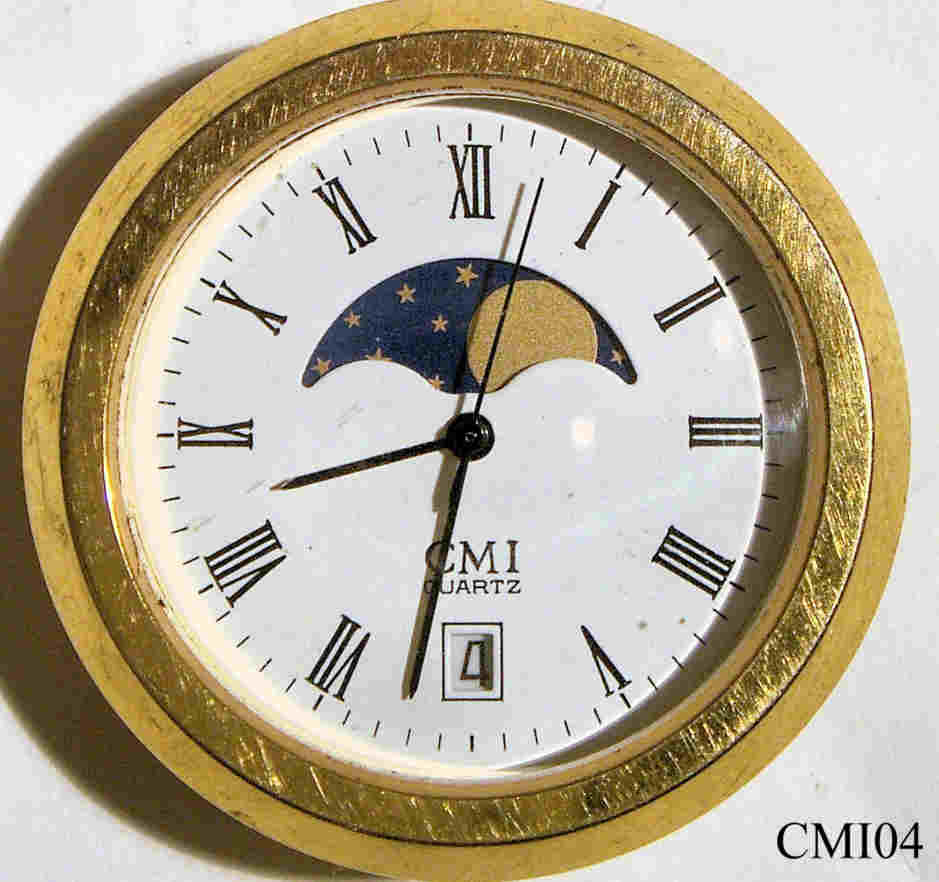 Eine schöne Einbauuhr von CMI mit Mondphase und Datum bei der 6, beschriftet vorn: “CMI, Quartz”, hinten: ”Art.No. 629317, Batt. 364”, innen: ”unadjusted, No (0) Jewels, Miyota, 6M85 “. Stainless Steel Back. |
