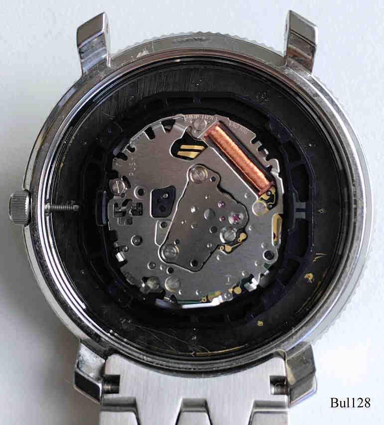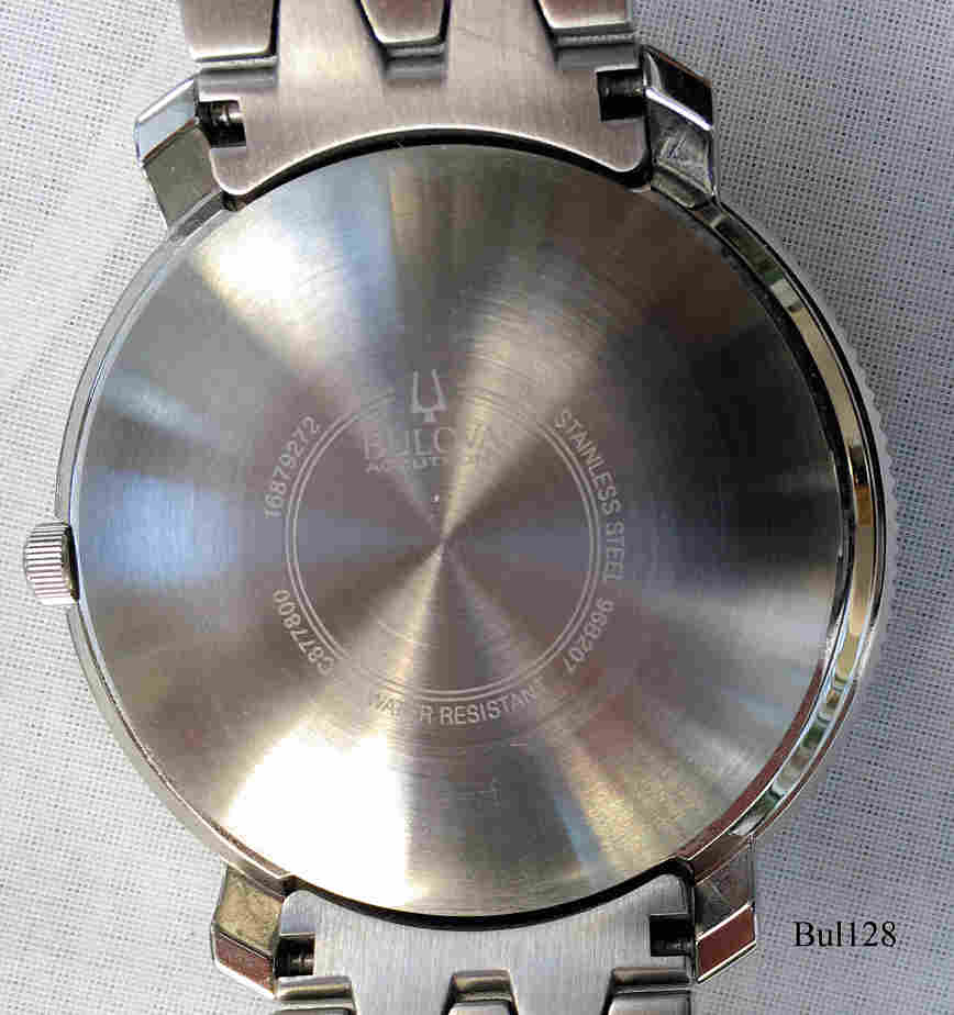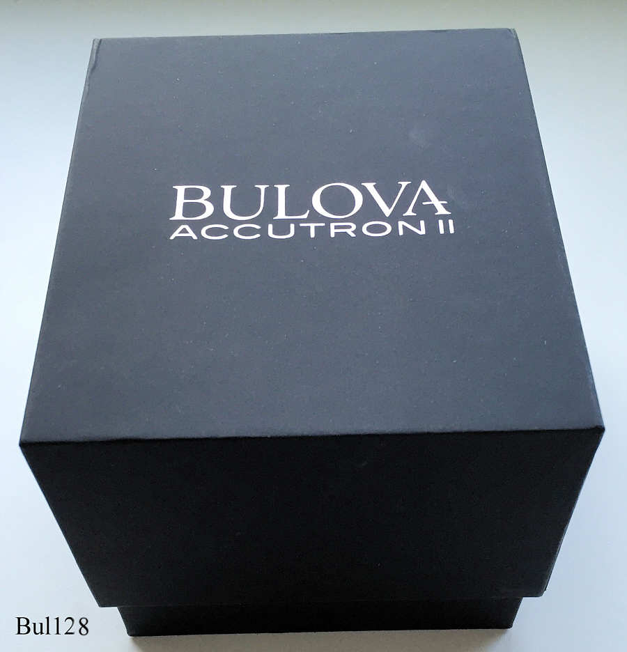 A Bulova Accutron II Moonview with Precisionist movement,where the second-hand moves continuously. Signed front: ”Bulova, Accutron II, BA 101.10”, back: “Bulova, Accutron II, B4, Stainless Steel, 96B207, Water Resistant, C377800, 16879272 ” inside: ”Bulova, 8 Eight Jewels”. Date code B4 = 2014, Movement BA 101.10 Precisionist, Stainless Steel Coffin Link band.