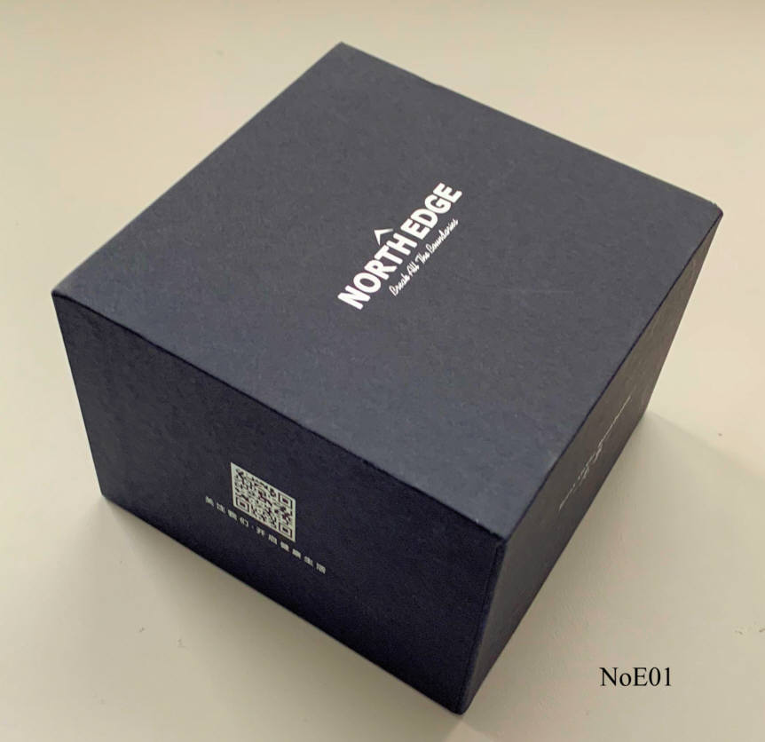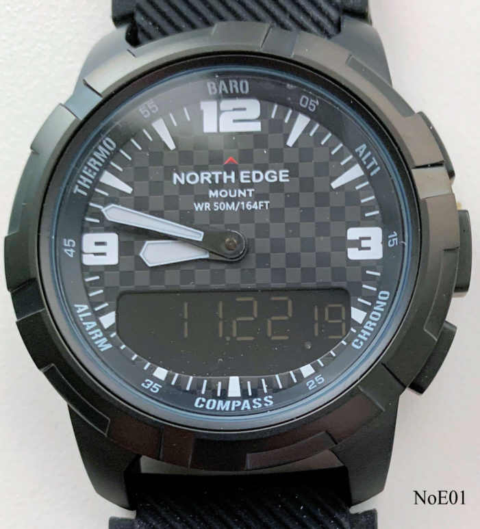 A North Edge multifunktion watch, Modell Mount. Stainless Steel case, signed front: ”North Edge, Mount, WR 50 M/164 Feet”, inside: “ ”, back: ”North Edge, Mount, WR 50 M / 164 ft, Designed by, North Edge”. At 6 an LCD Display to show the funktions. The watch has a Magnet-, Thermo- und Air pressure sensor, to handle following funktions: Air pressure (Meteo), Altitude (Alti), Temparature (Thermo),Compass (Compass), as well as Alarm, Chrono, Date and time. Selection of the funktions is done via the middle button, and circles the functions. The pointers show the selected function and the corresponding value is shown in the LCD. In the compass function the pointers set straight and the minute pointer points to the North, the hour pointer to theSouth€. This is a not so true copy of the Tissot T-Touch, without the sensitive Display.