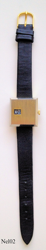 A mechanical Digital Nelson handwind watch. It is a normal Ebauches handwind movement, two discs are turning: Hour-, and minute disc. Signed front: ””, back: ”Nelson, 17 Jewels, Swiss Made, Stainless Steel Back, Base Metal Case”, inside: “Michael Z Berger, Swiss, 17 Jewels, Seventeen, Unadjusted, EB 8461”.