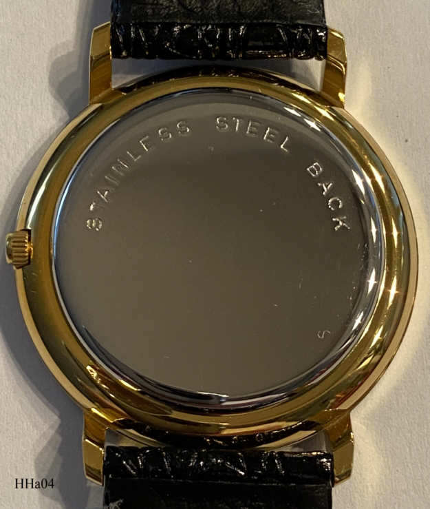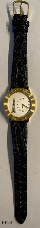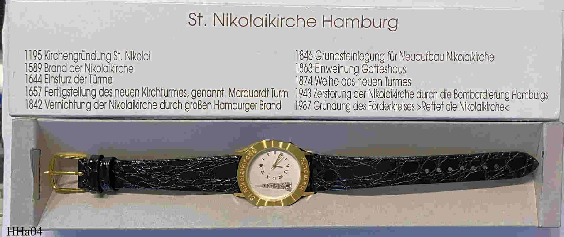 A Fund Raiser Watch for the reconstruction of the tower of the St.Nikolai church as memorial of the second world war. SDigned front: “St. Nikolaikirche, Hamburg”, back: “Stainless Steel Back”, inside: “ETA, Swiss Parts, One 1 Jewel, Assy in Thailand”. Black croco band.