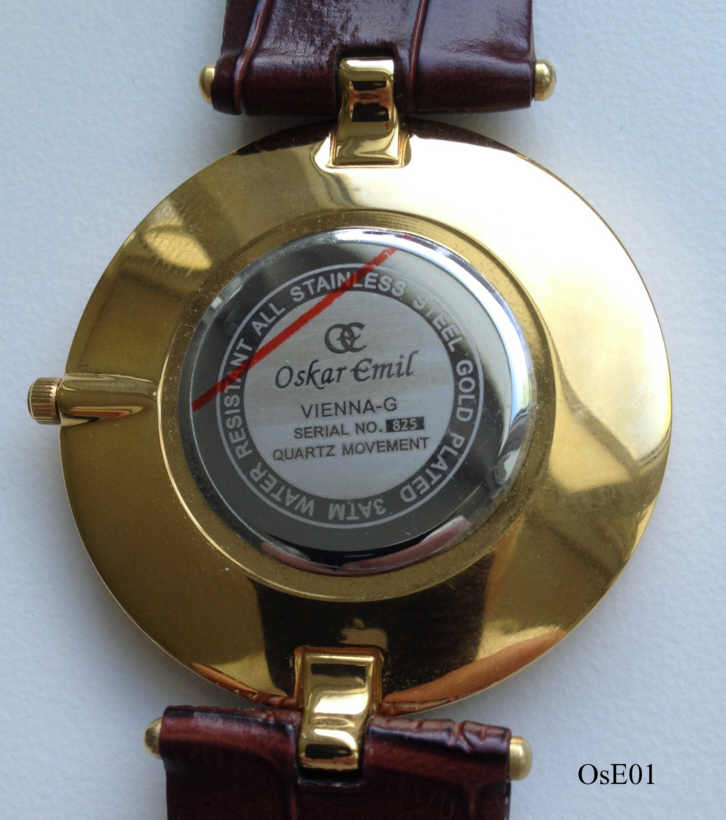 Eine Quartz Uhr der Marke Oskar Emil, Modell Vienna red, mit rotem Zifferblatt. Base Metal Gehäuse und Stainless Steel Back. Beschriftung vorn: ”Oskar Emil”, hinten: ”All Stainless Steel, Gold Plated, 3 ATM Water Resistant, Oskar Emil, Vienna-G, Serial Nr.: 825, Quartz Movement”, innen: “Japan, No 0 Jewels, Miyota Co., 1L22”, Braunes Lederarmband. Werk Miyota Kaliber 1L22