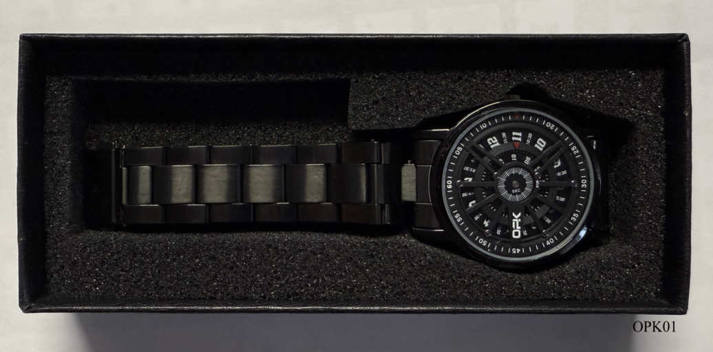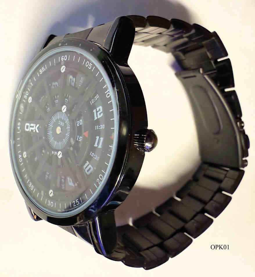 An Fun watch of a chinese (?) brand OPK The special dial shows the time at the position of the three.Signed front: “OPK”,Back: “Oukeshi, Stainless Steel Back: “OPK, Water Resistant, Quartz Movement, No.8126€, inside: ” OPK, Water Resistant, Quartz Movement, No.8126”, inside: “8975”, Black Stainless Steel case and black Stainless Steel band.€