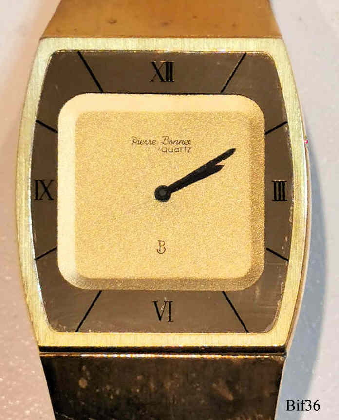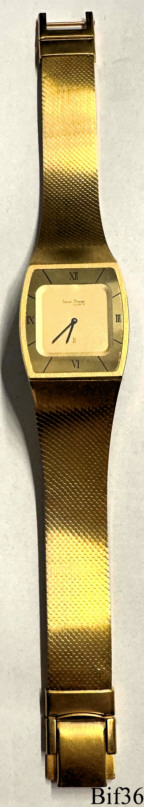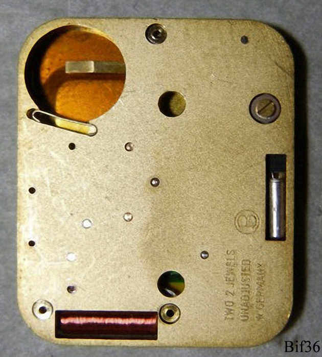 This is a Bifora quartz watch, using the slim-line movement B18 of Bifora. At the market placement it was the slimmest watch in the world with 3,0mm..  This B18 movement is a separate one, the alignment is at the side. The watch has a very attractive golden case. Signed front: ” BIFORA, Quartz” back:”Two Jewels, Unadjusted, W. Germany, B”, Caliber: Bifora B18”, blue leather band.