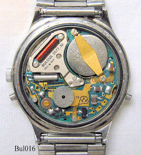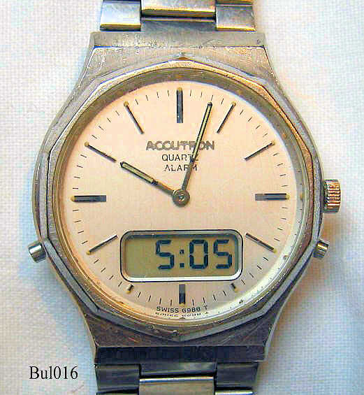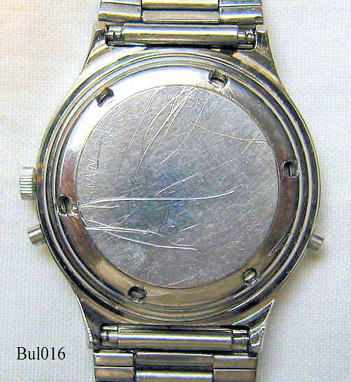 Bulova quartz Alarm, a combination of a digital and an analog quartz watch, similar to Combitron. Signed front: “Bulova, Quartz, Alarm, Swiss 6988 T”, back: “Stainless Steel Case, Bulova, P0”, inside: “Bulova 2577.10, Cell 604, unadjusted, seven (7) Jewels, Swiss made, Y2, ESA 900.911”, LCD shows the alarm time. In the back is a piezo speaker for the alarm, date of manufacture 1990 (P0). Stainless Steel band with neutral clasp.