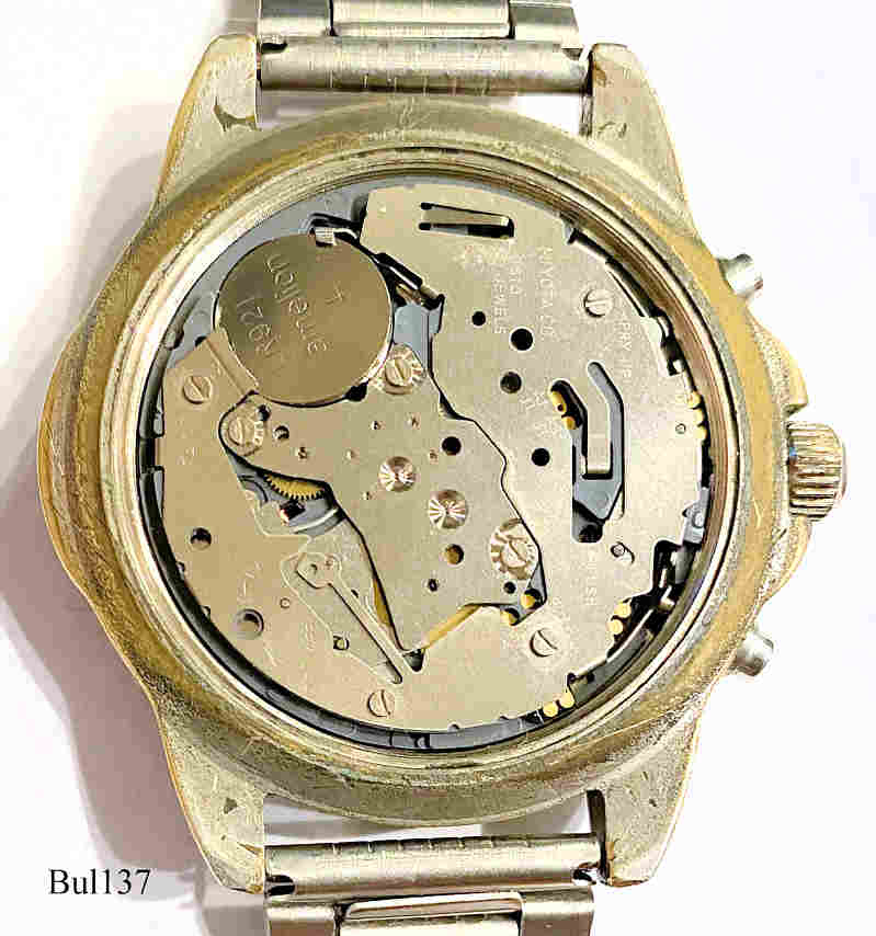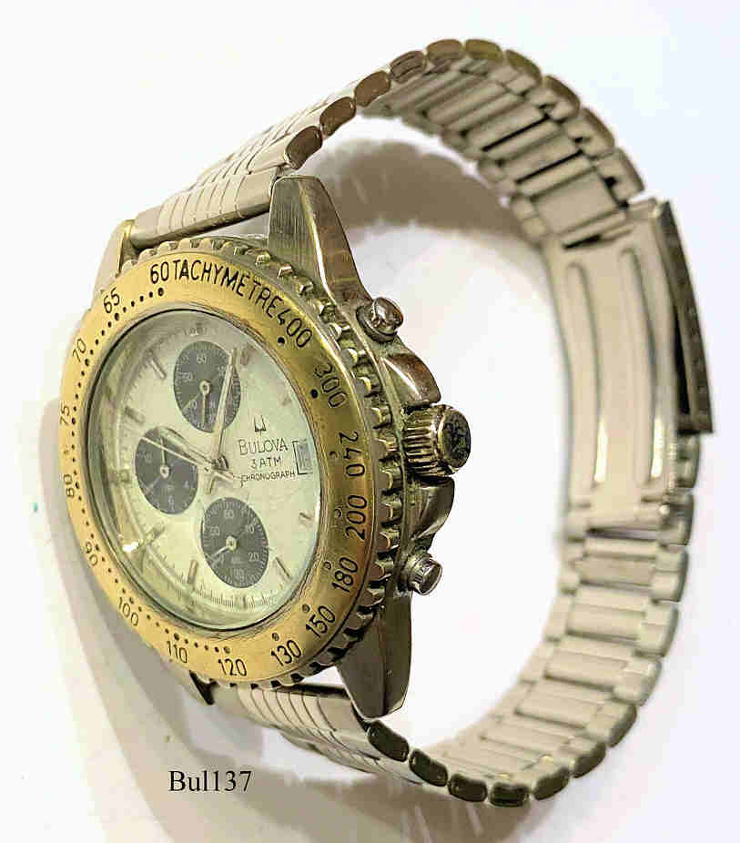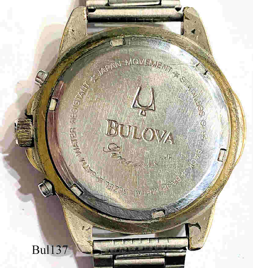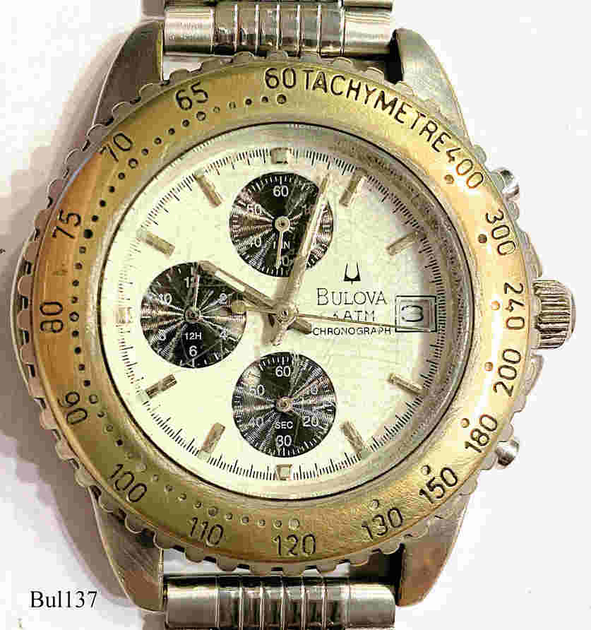 Ein Bulova Quartz Chronograph, weißes Zifferblatt, schwarze “Augen”. Anzeige bei 3: Datum, bei 6: Sekunde, bei 9: 12 Std.. Beschriftet vorne: ”Bulova, 5 ATM, Chronograph”, hinten: “Bulova, Since 1875, Japan Movement, Stainless Steel Back, Base Metal Bezel, 5 ATM Water Resistant, Japan”, innen: ”Miyota Co., 0S10, No Jewels,”, Kaliber Miyota 0S10.