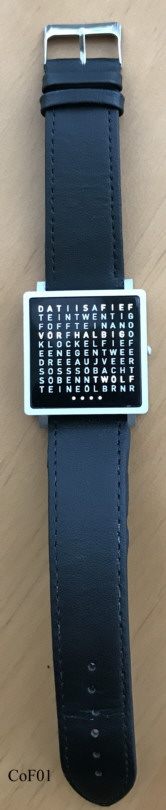 Eine QLOCKTWO W Armbanduhr von Cornelius Franz. Diese Uhr zeigt die Zeit in der Form an, wie man sie normalerweise spricht, deshalb auch das Synonym “Wortuhr”. Nach einfachem Drücken des Drückers rechts wird die Zeit angezeigt, bei nochmaligem Drücken das Datum, nochmaliges Drücken ruft die Sekundenanzeige ab. Die Zeit wird in fünf Minuten Schritten angezeigt, die leuchtenden der vier Punkte unten müssen zu der angezeigten Zeit addiert werden. Diese Uhr gibt es auch als Wanduhr. Diese Uhr ist als Einzelanfertigung in Plattdeutsch entworfen worden.
