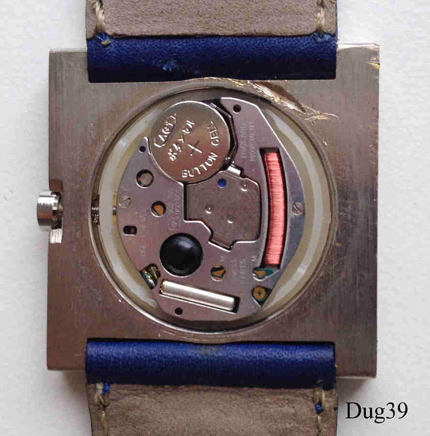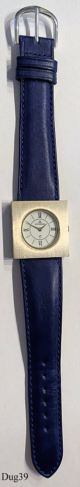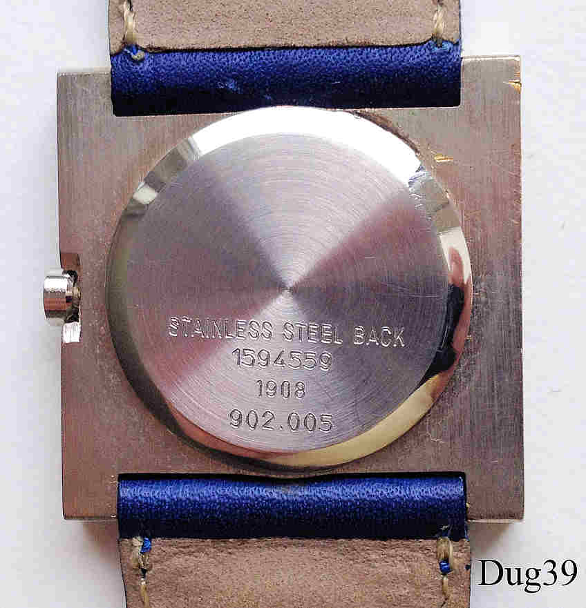 Eine Dugena Damen Quartzuhr mit quadratischem Gehäuse und Stainless Steel Back. Beschriftung vorn: “Dugena, Q”, hinten: ”Stainless Steel Back, 1594559, 1908, 902.005”, innen: ”One Jewel, ESA 902.001, 902.105, Swiss Parts, Thailand Movement”. Blaues Leder Armband.