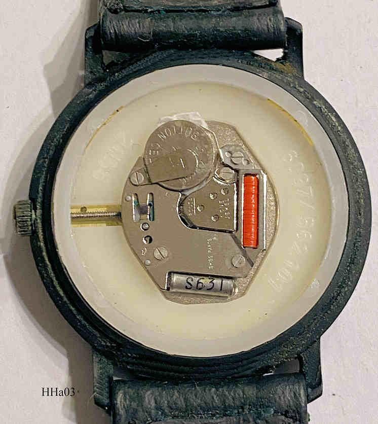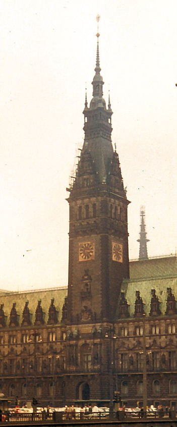 Eine Motivuhr zum 100jährigen Bestehen des Hamburger Rathauses 1997. Das Zifferblatt besteht aus Oxydiertem Kupfer aus dem Rathaus Dach. Beschriftet vorn: “ ”, hinten: ”Stainless Steel Back, Water Resistant 3 ATM, Gravur: 1897 - 1997, 100 Jahre, Hamburger, Rathaus, Nr.: 819”, innen: “Swiss Parts, Ronda, 1 One Jewel, 763, LFB”, Schwarzes Lederarmband
