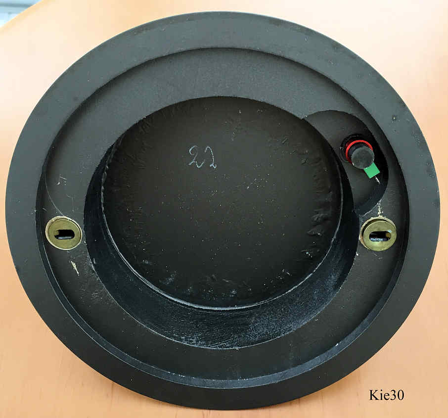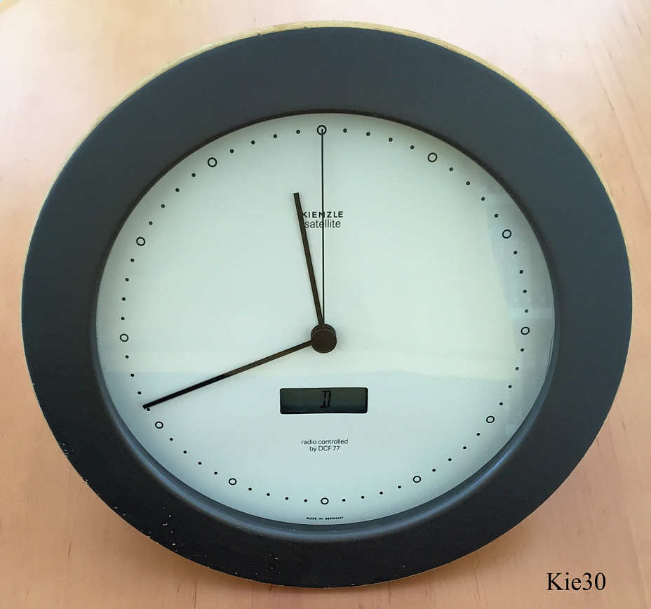 A Kienzle Radio Controlled clock in a futuristic satellite case. White dial, LCD window for the date display. Signed front: “Kienzle, Satellit, Radio Controlled, by DCF 77” back: “ “.