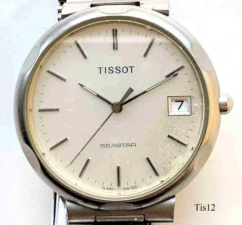 Eine Tissot Seastar Quartz Uhr mit Titan Gehäuse und Titan Back, Datum bei der 3, Beschriftet: “Tissot, Seastar, Made in Swiss” hinten: “Seastar, Quartz, Water Resistant 30 M, N 350/450”, Edelstahlarmband. Caliber ETA 955.112