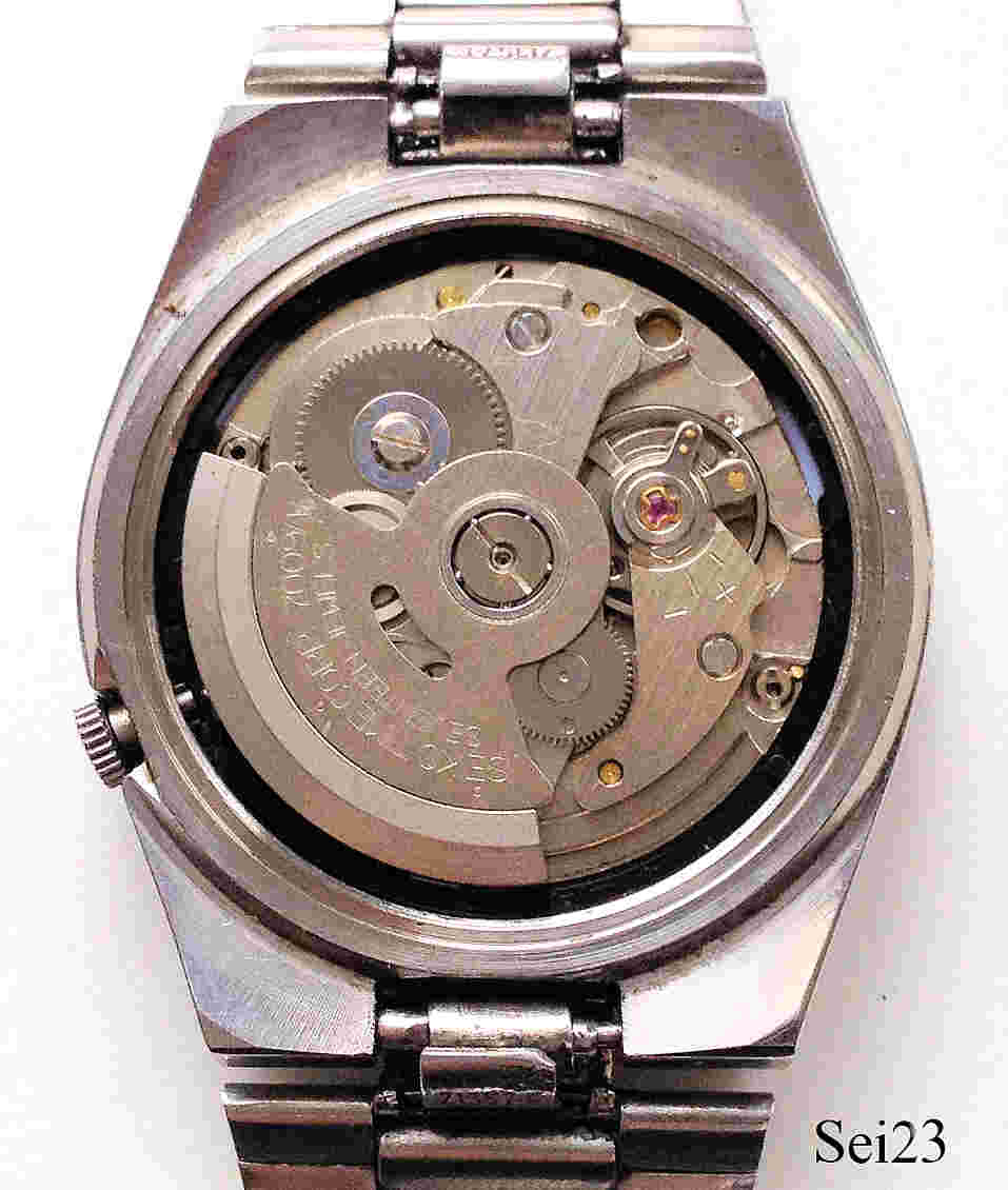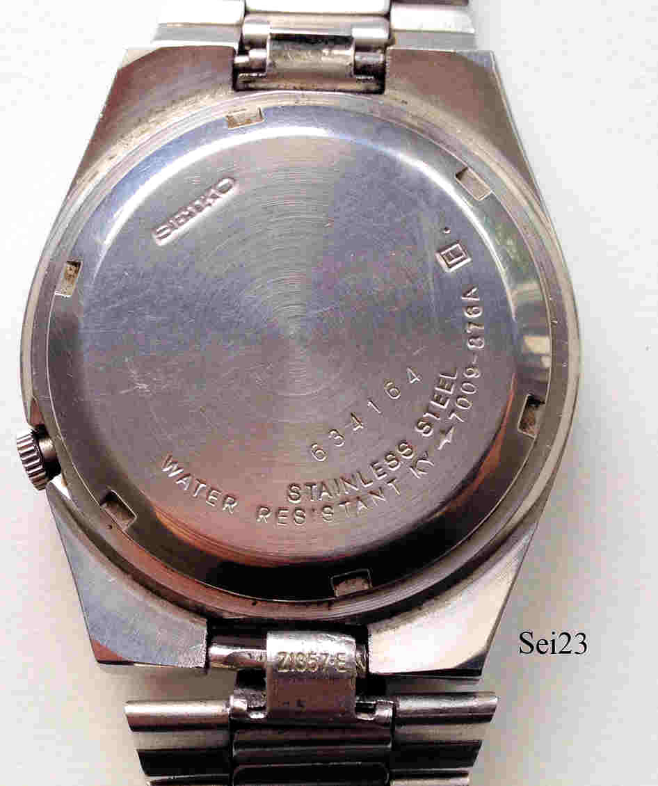 Dies ist eine Seiko 5 Automatik Uhr mit Edelstahl Gehäuse, schwarzem Zifferblatt und Day/Date Anzeige bei der 3. Beschriftung vorn:” SEIKO, 5, Automatic, 7009-498R R“, hinten: “Seiko, 634164, Stainless Steel, Water Resistant, KY 7009- 876A”, innen: “Seiko Time Corp, 7009, Seventeen Jewels”. Edelstahlgehäuse mit Edelstahl Boden und Metall- Gliederarmband.