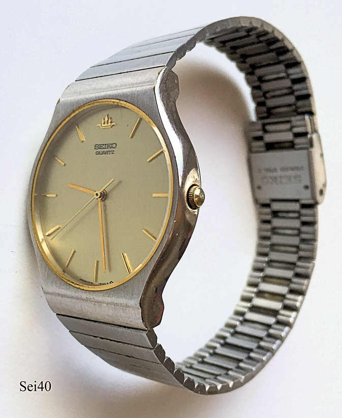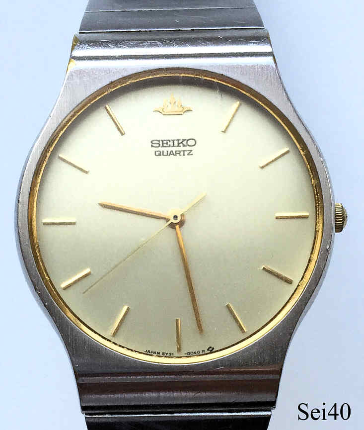 A simple quartz mans watch with a cream colored dial. No date, signed front: “€¯ Seiko, Quartz”, innen: “Seiko Time Corp.,5Y31A, One (1) Jewel, Japan”€¯, hinten: “€¯Seiko, Base Metal, St. Steel Back, 5Y31- 8010 RO, Japan D, 860155”€¯  with stainless steel back straight steel band.