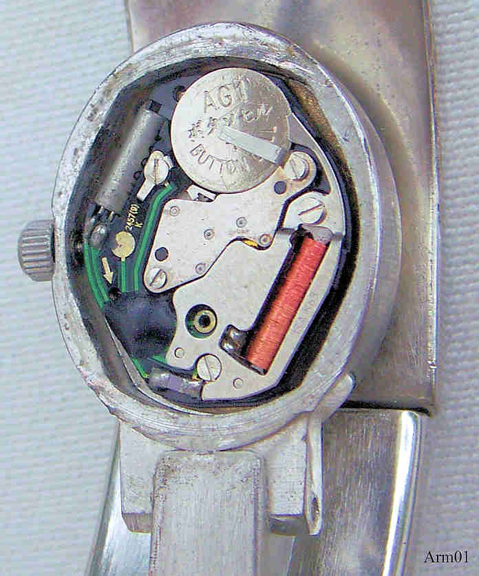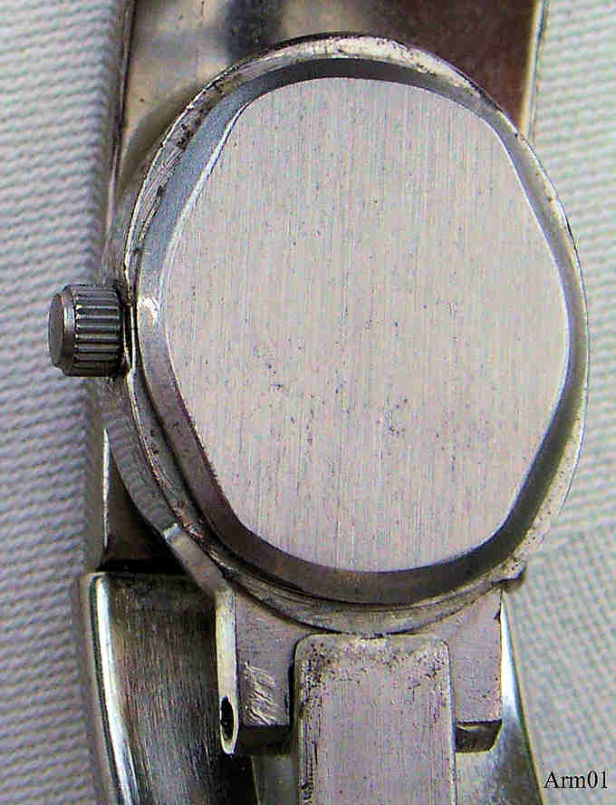 This is a dresswatch in form of a bracelet. Usually the watch is hidden, to read the time the bracelet has to be opened, then the watch appears. Signed front: ”Quartz”, back: ””, inside: “No (0) Jewels, Swiss Parts, Movement China, Prestige Time LTD, ISA K63”. ISA K63 movement. No Brand Identification. |