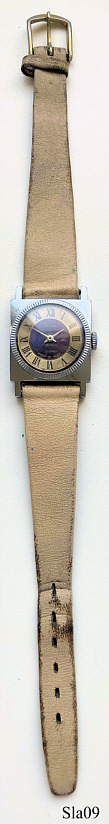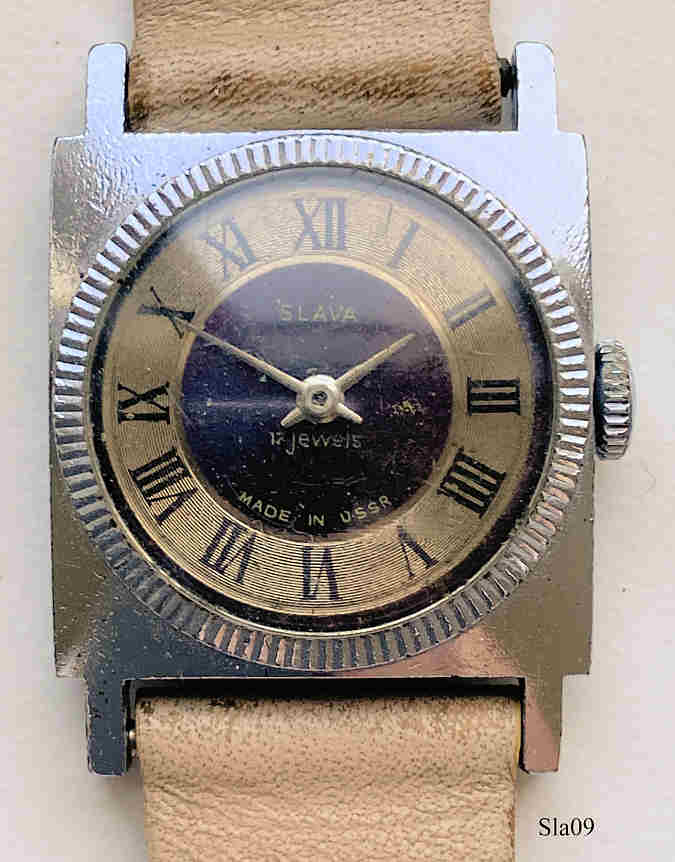 Eine russische Slava Damenuhr mit Base Metall Gehäuse und Edelstahlrücken, Zifferblatt mit schönen römischen Ziffern, 17 Steine, Werk Nummer 3797365, Kaliber 1600, sehr schön verarbeitet, hremefarbenes Lederarmband. Beschriftung auf dem Zifferblatt: ”SLAVA, 17 Jewels, Made in USSR”, innen: “ 1600, 3797365”, hinten: “Water Protected”.