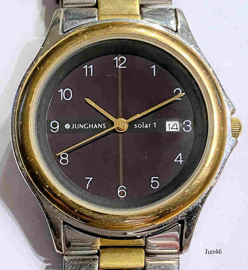 Eine Junghans Solar Damen Armbanduhr mit Kalender bei der drei. Das Zifferblatt ist eine große Solarzelle, die bei Sonnen Einstrahlung Strom erzeugt und in einem Kondensator GC920 speichert. Dieser Kondensator treibt dann eine normale Quartz Uhr an. Inschrift vorn: ”Junghans Solar 1”, hinten: ”Base Metal Bezel, Stainless Steel Back, Water Resistant 30m, QUARTZ, 24-1112”, innen: “Japan, V122A, Shiojiri Ltd., Unadjusted, One 1 Jewel”. Bicolor Metallarmband