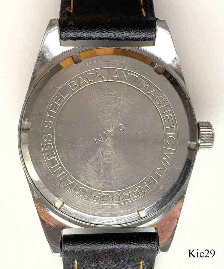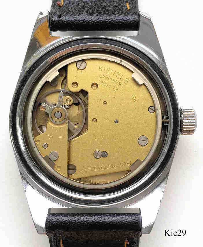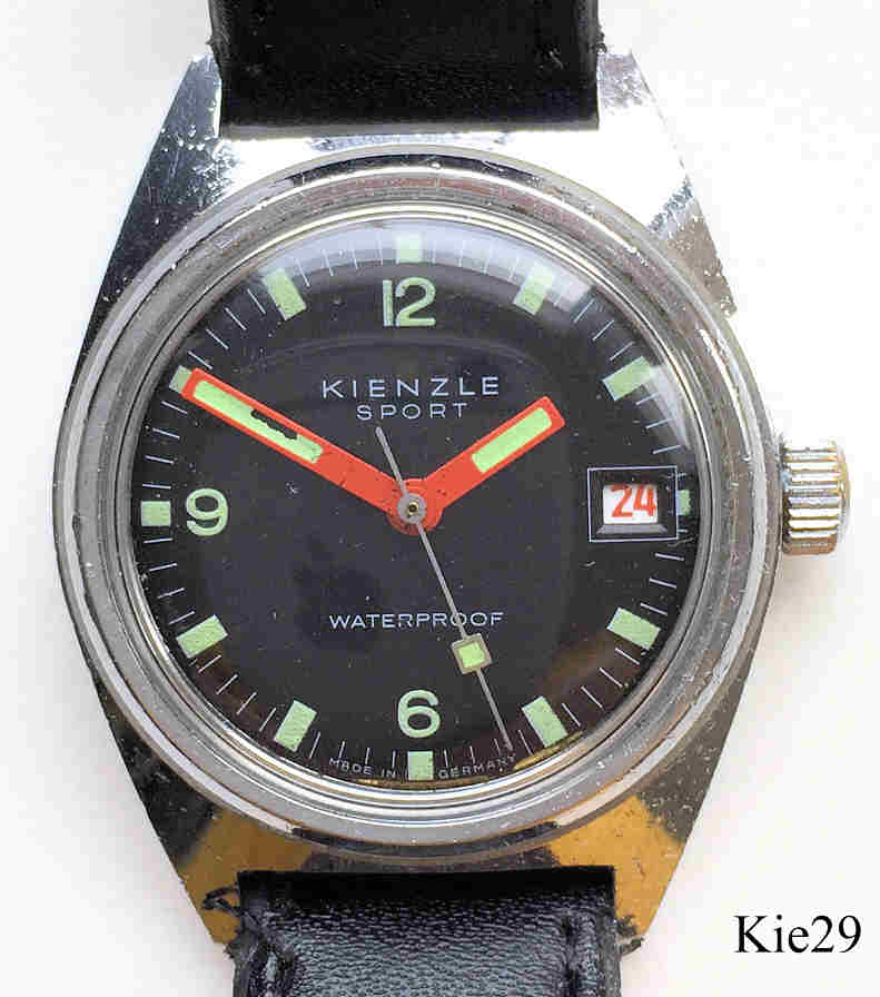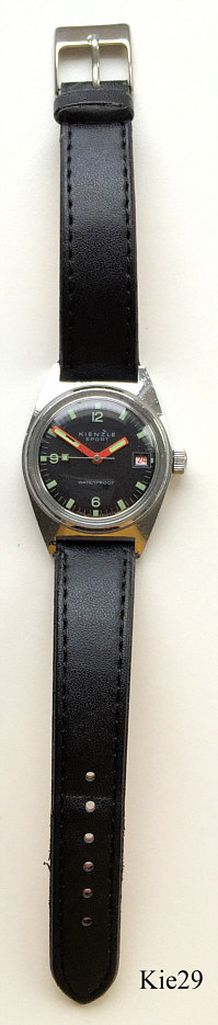 Dies ist eine Kienzle Sport Handaufzugs Uhr mit schwarzem Zifferblatt. Beschriftet vorn: ”Kienzle, Sport, Waterproof, Made in Germany”, Rückseite: ”Stainless Steel Back, Antimagnetic, Waterproof, 6 ATM”, innen: “Kienzle Germany, D58c12, WB, one Jewel, Unadjusted”. Base Metal Gehäuse mit Edelstahl Boden, schwarzes Leder Armband.