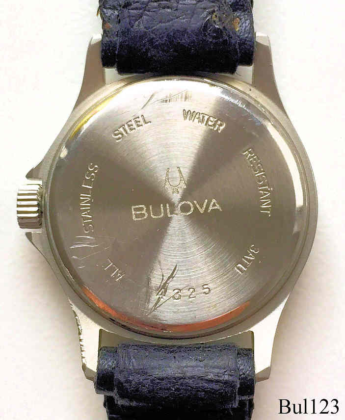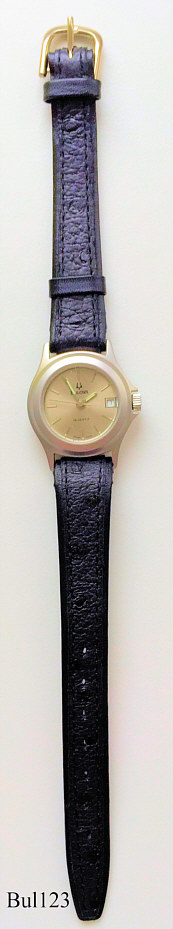 Bulova Ladies Quartz watch with silver grey dial, signed front: “Bulova, Quartz”, back: “BULOVA, All Stainless Steel, Water Resistant 3 ATM,4325 ” inside: ”Seven 7 Jewels, Swiss ”, Movement ETA 956.114. Black Leather band.