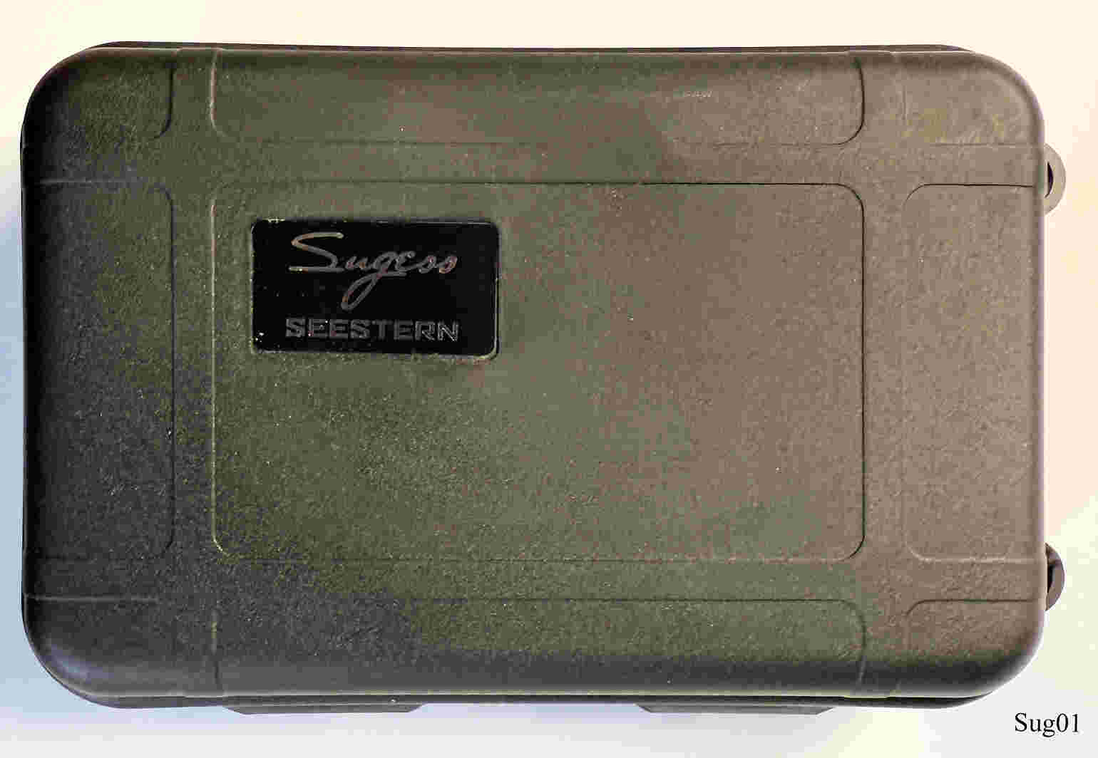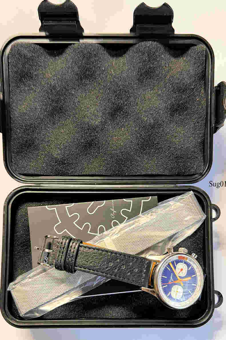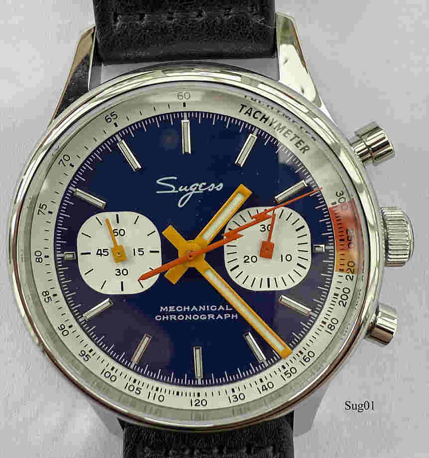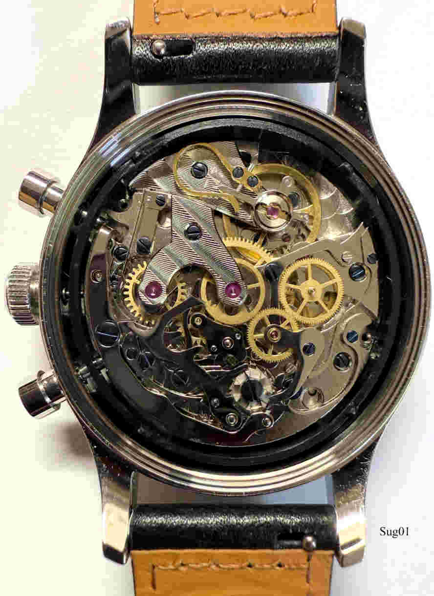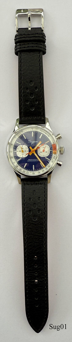 Ein Sea Gull (Möve) Schaltrad Chronograph der Tochterfirma Sugess (Seestern). Das Original Venus 175 wurde 1963 gebaut,Und die Marke mit allen Maschinen an Seagull.verkauft. Seagull entwickelte dann daraus ihr Kaliber 19, später 1901. Sugess verfeinerte das Kaliber dann durch einbau einer Schwanenhals Justage. . Beschriftet vorn: ”Sugess, Mechanical, Chronograph”, hinten:”Chronograph, Mechanical, II ST1901, 5 ATM, Stainless Steel, S.G 287”, innen: ” “€¯. Gehäuse aus Edelstahl, verschraubter Glasboden, Kaliber ST1901