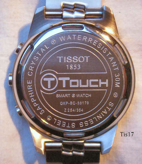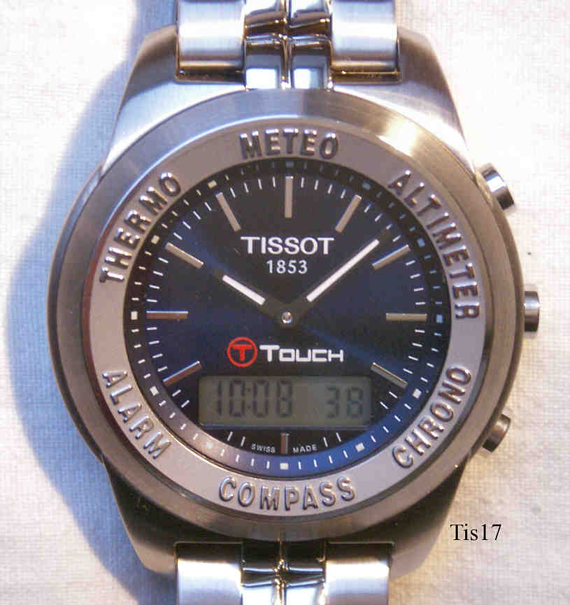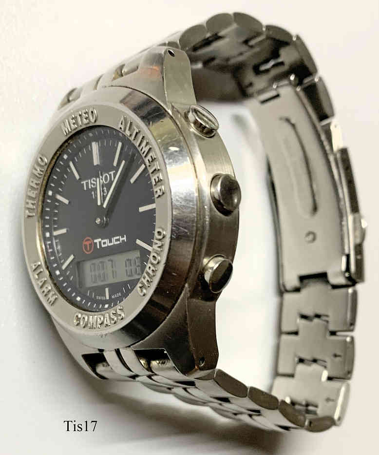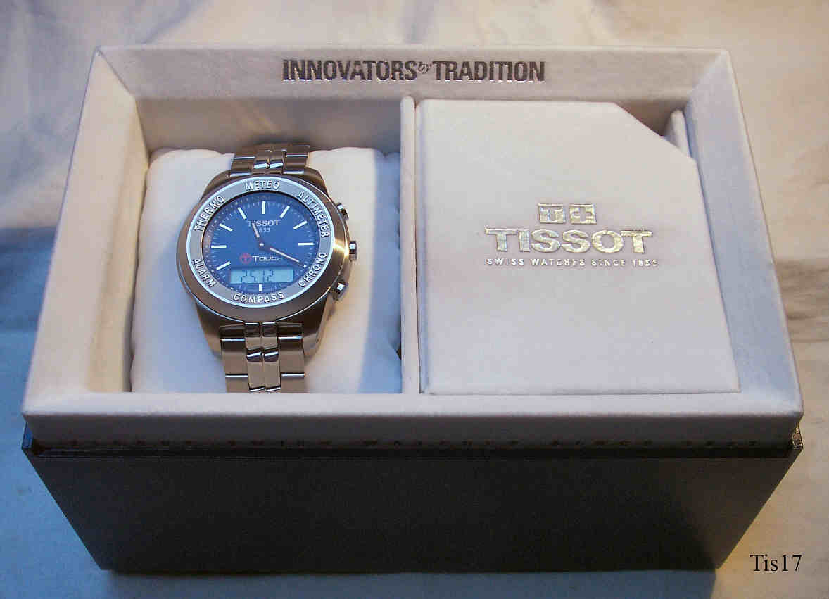 Eine Tissot T-Touch Multifunktionsuhr. Werk Caliber ETA E48.385, Edelstahlgehäuse. Beschriftet vorn:” Tissot, 1853, T-Touch, Swiss Made, Thermo, Meteo, Altimeter, Alarm, Compass, Chrono”, innen: “ ETA E48.385, No (0) Jewels, Swiss Made V8, Battery CR1632, 16x3,2, 3V”, hinten:”Sapphire Chrystal, Water Resistant 30M, Stainless Steel, Tissot 1853, T-Touch, Smart Watch, QKP-BC-33179, Z254/354”. Über der 6 ein LCD Display für die Funktionsanzeigen. Die Uhr hat einen Magnet-, Thermo- und Luftdrucksensor, mit denen sie folgende Funktionen anzeigen kann: Luftdruck (Meteo), Höhe (Altimeter), Temperatur (Thermo), Kompass (Compass), sowie Alarm, Chrono, Datum und Zeit. Die Auswahl der Funktion erfolgt über den Touchscreen, der durch Druck auf den mittleren Drücker aktiviert wird, dann berührt man das Glas an der Stelle der gewünschten Funktion. Die Zeiger zeigen dann gemeinsam auf die gewählte Funktion und der entsprechende Wert wird in dem LCD Display angezeigt. Beim Kompass bilden die Zeiger eine Linie und der Minutenzeiger zeigt auf “Nord”, im Display wird die eingegebene magnetische Korrektur angezeigt. Auch die Werksverpackung ist ein Kunstwerk für sich. Gekauft in der Somerset Mall während unserer Kapstadt Reise.