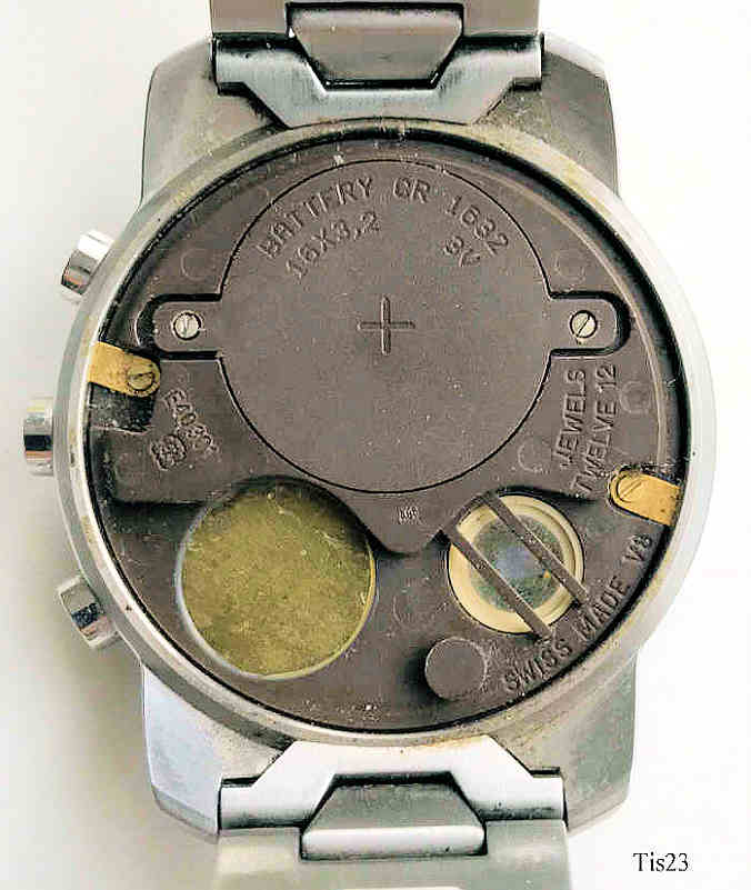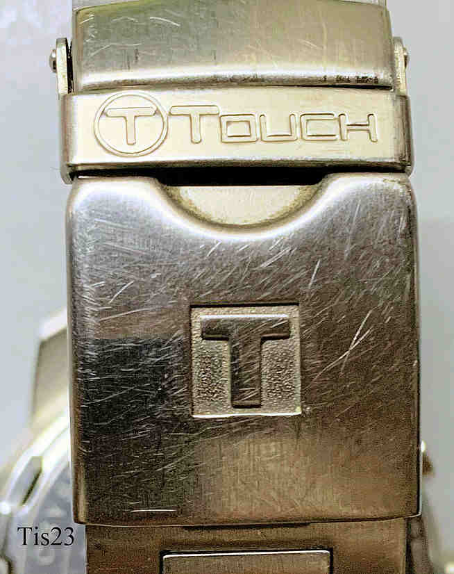 Eine Tissot T-Touch Multifunktionsuhr. Werk Caliber ETA E40.301, Edelstahlgehäuse. Beschriftet vorn : ”Tissot, 1853, T-Touch, Swiss Made, Thermo, Meteo, Altimeter, Alarm, Compass, Chrono”, innen: “ETA E40.301, 12 Jewels, Swiss Made V8, Battery CR1632, 16x3,2, 3V”, hinten: ”Sapphire Chrystal, Water Resistant 30M, Stainless Steel, Tissot 1853, T-Touch, Smart Watch, QKT-RA-40688, Z251/351”. Über der 6 ein LCD Display für die Funktionsanzeigen. Die Uhr hat einen Magnet-, Thermo- und Luftdrucksensor, mit denen sie folgende Funktionen anzeigen kann: Luftdruck (Meteo), Höhe (Altimeter), Temperatur (Thermo), Kompass (Compass), sowie Alarm, Chrono, Datum und Zeit. Die Auswahl der Funktion erfolgt über den Touchscreen, der durch Druck auf den mittleren Drücker aktiviert wird, dann berührt man das Glas an der Stelle der gewünschten Funktion. Die Zeiger zeigen dann gemeinsam auf die gewählte Funktion und der entsprechende Wert wird in dem LCD Display angezeigt. Bei Kompass bilden die Zeiger eine Linie und der Minutenzeiger zeigt auf “Nord”, das Display zeigt die eingegebene magnetische Korrektur an.
