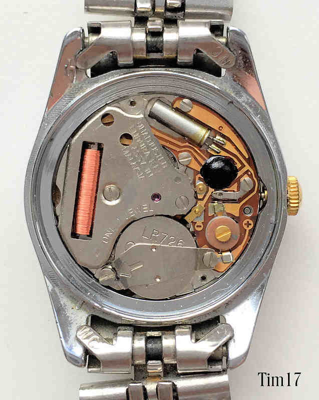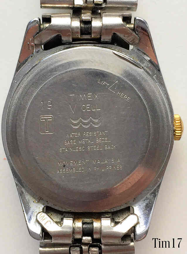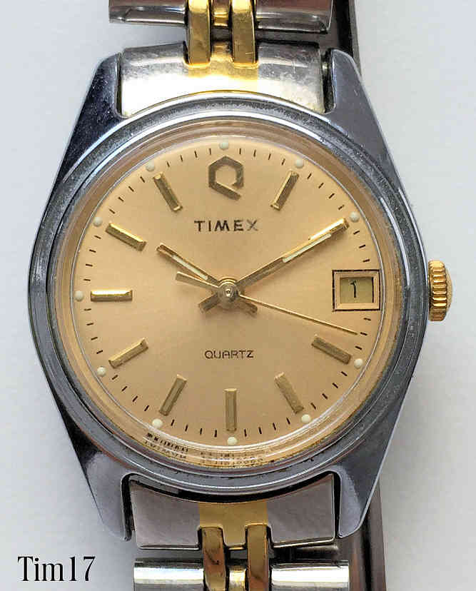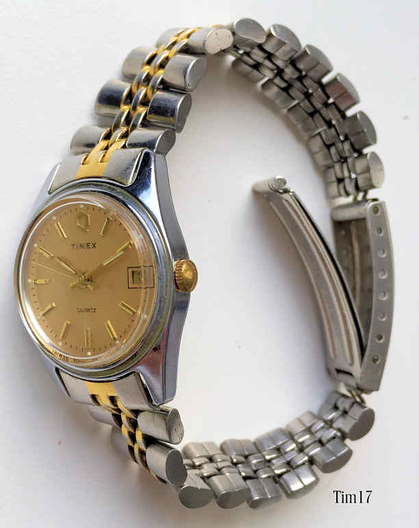 Dies ist eine Timex Damen Quartzuhr mit goldfarbenem Zifferblatt, Datum bei der 3. Beschriftet vorn: “Timex, Quartz”, hinten: “Timex V Cell, Water Resistant, Base Metal Bezel, Stainless Steel Back, Movement Malaysia, Assembled in Phillippines, T, 19”, innen: “Unadjusted, Endura F.E., Assy in, Malaysia, One 1 Jewel”. Edelstahl Gliederarmband mit Goldstreifen.