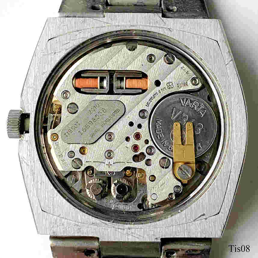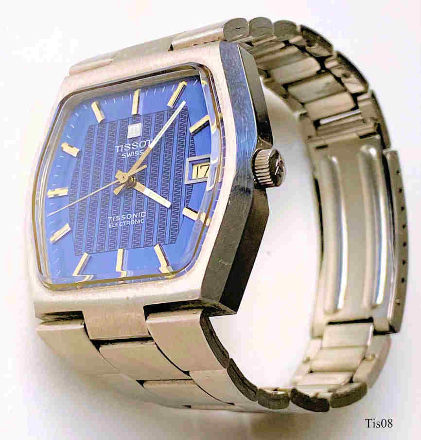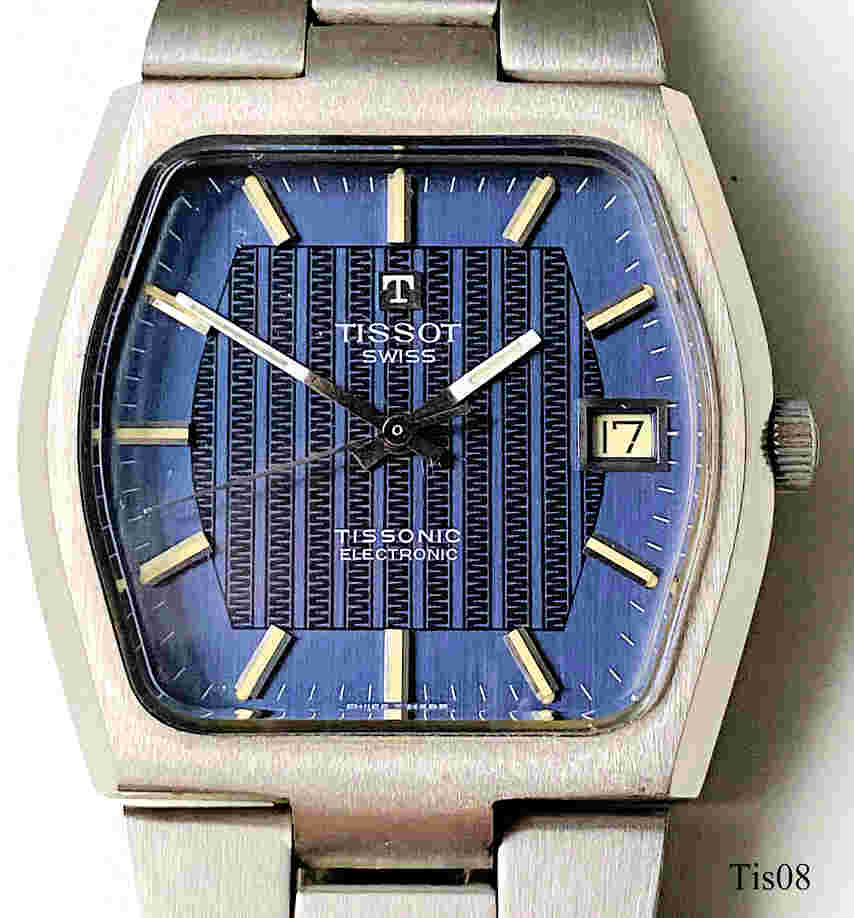 Eine sehr große Tissot Tissonic Stimmgabeluhr mit Metallarmband und Tissot Schließe. Caliber Tissot 2010, ETA 9162, Werk Nummer: 16698558, Gehäuse Nummer: 40.801. Datum bei der 3, sehr schönes Zifferblatt. Edelstahl mit geschraubtem Boden. Beschriftet vorn: “Tissot, Swiss, Tissonic, Electronic”, inside: “Tissot 2010, 16698558, Swiss, Unadjusted, Lic. Bulova & Pat.ETA, Twelve 12 Jewels”