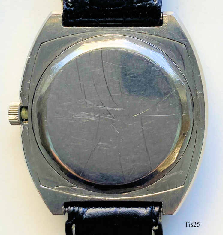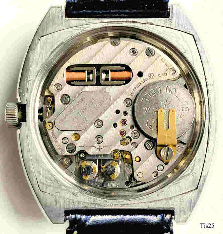 Eine Tissot Tissonic Stimmgabeluhr mit Metall Glieder Armband. Caliber Tissot 2010, ETA 9162, Werknummer , Gehäuse Nr. 40.800 in Base Metal. Geschraubter Edelstahlboden, keine Beschriftung auf der Rückseite. Beschriftet vorn: “Tissot, Swiss, Tissonic, Electronic”.