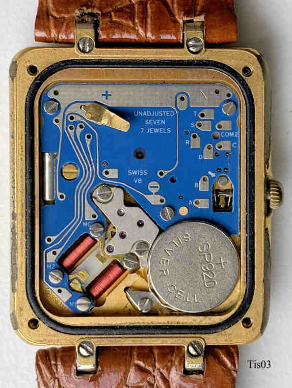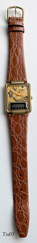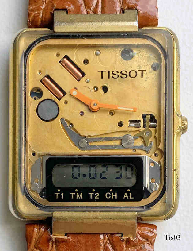 Eine Tissot Twotimer Uhr ohne Zifferblatt mit Base Metal Gehäuse und Stainless Steel Back. Das Digitaldisplay zeigt 5 verschiedene Funktionen: Zeit 1, Zeit 2, Timer, Chronograph und Alarm. Die Einstellung erfolgt über die Krone: in Normalstellung wird die Anzeige umgeschaltet, in gezogener Stellung werden die Einstellungen vorgenommen und durch Drücken wird die Funktion eingeschaltet (Alarm etc.) Beschriftet: “Tissot, T1, TM, T2, CH, AL” hinten: ”TISSOT, Swiss Quartz, Waterresistant 3 ATM, Stainless Steel, Back, D 374687 0”. Werk ETA Kaliber 958.335.