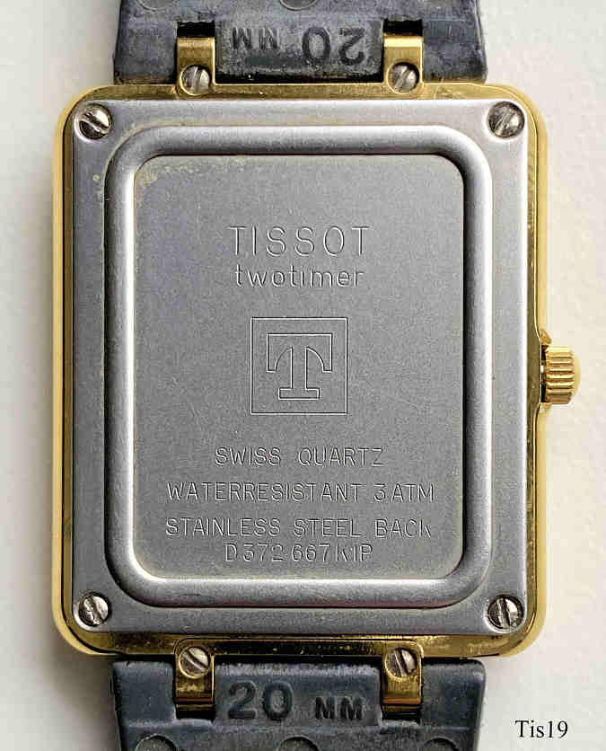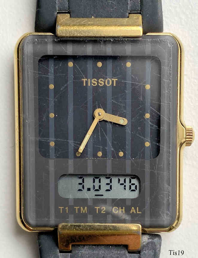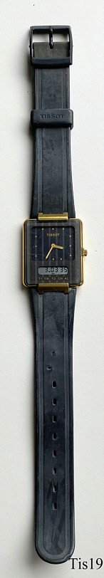 Eine Tissot Twotimer Uhr mit grauem Zifferblatt mit Base Metal Gehäuse und Stainless Steel Back. Das Digitaldisplay zeigt 5 verschiedene Funktionen: Zeit 1, Zeit 2, Timer, Chronograph und Alarm. Die Einstellung erfolgt über die Krone: in Normalstellung wird die Anzeige umgeschaltet, in gezogener Stellung werden die Einstellungen vorgenommen und durch Drücken wird die Funktion eingeschaltet (Alarm etc.) Beschriftet: “Tissot, T 372 Swiss T, T1, TM, T2, CH, AL” hinten: ” TISSOT, Twotimer, Swiss Quartz, Waterresistant 3 ATM, Stainless Steel, Back, D 372667 K1P”.Kautschuk Armband.