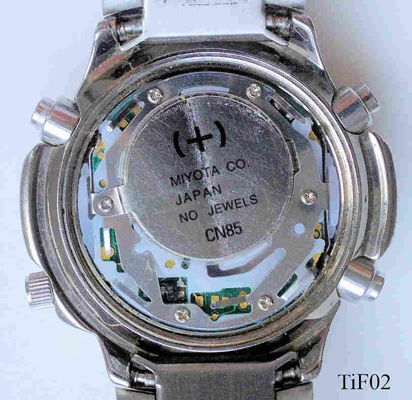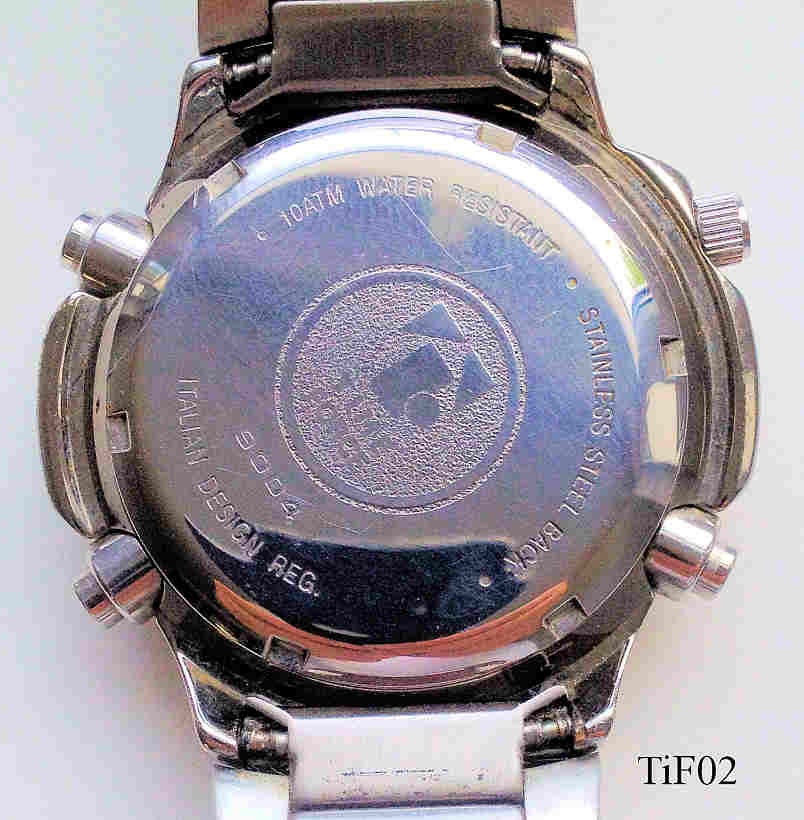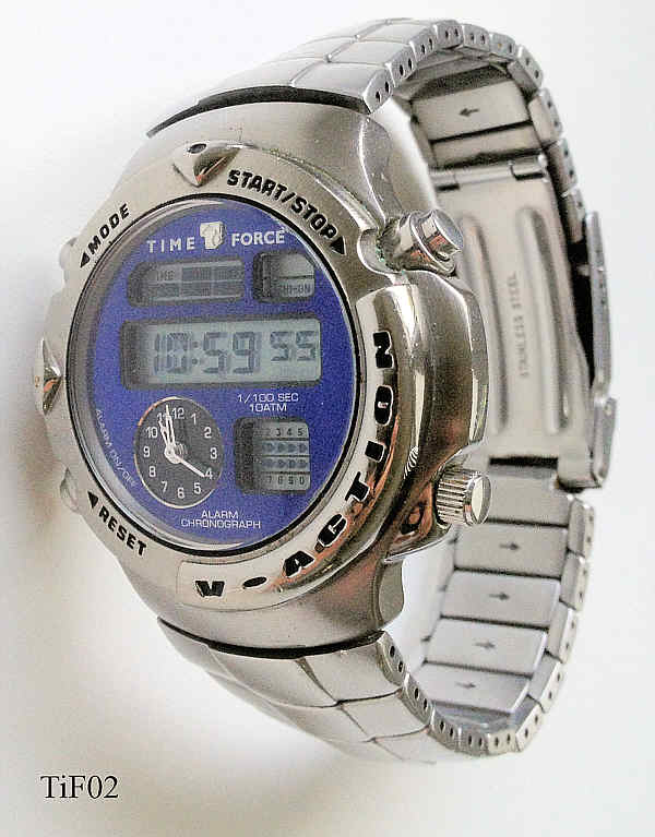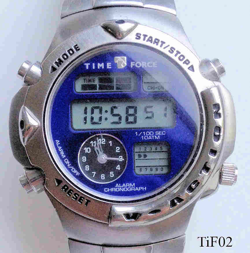 Ein sehr moderner Ana-Digi Chronograph von Time Force. Im Fenster oben links ist die aktuelle Funktion zu sehen, Oben rechts der Chime Status, in der Mitte die Zeit oder Datum, unten rechts die Split seconds. Unten links dann die Analog Uhr. Edelstahl Gehäuse mit Edelstahlarmband. Beschriftet innen: ”Miyota Co, Japan, No Jewels, CN85”, hinten: ”10 ATM Water Resistant, Stainless Steel back, 9004, Italian Design reg., Time Force”