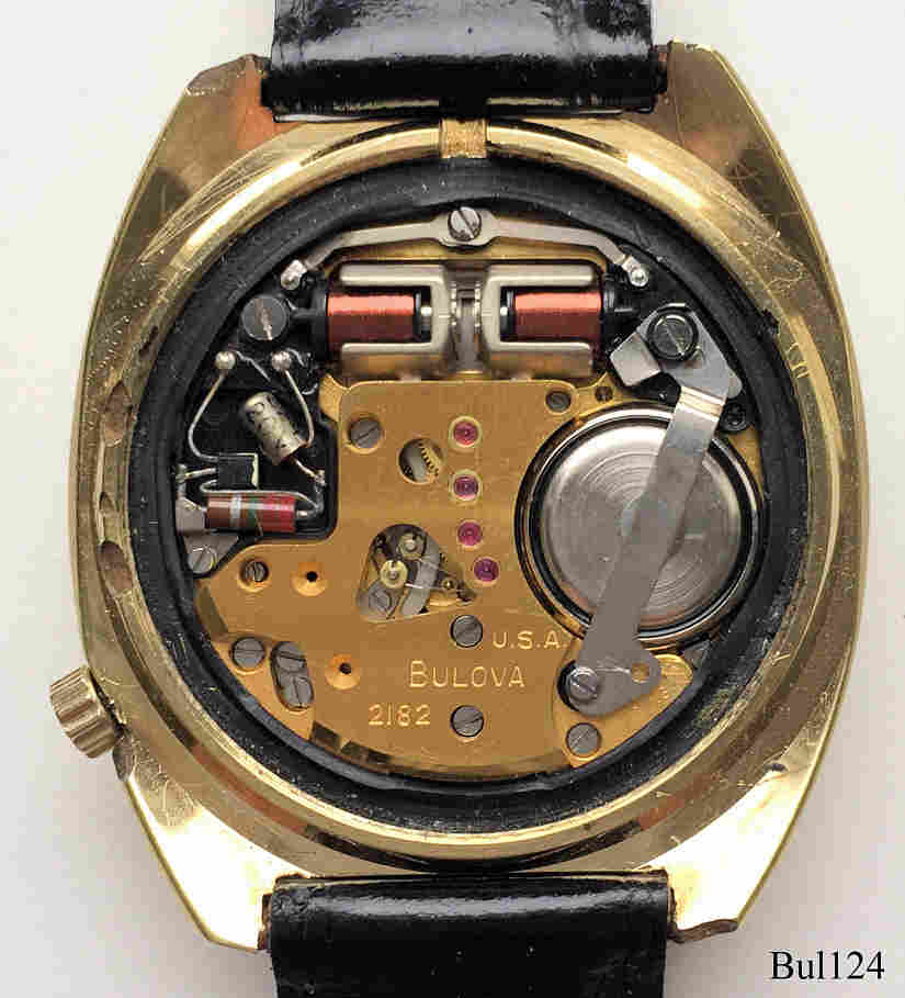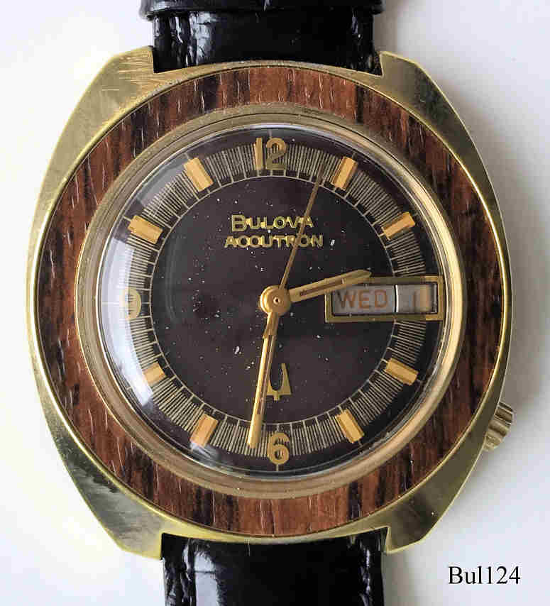 Eine Bulova Accutron mit Base Metal Gehäuse und einem Teakholz Ring um das Zifferblatt, deshalb auch genannt ”Woody”. Beschriftet vorn: “Bulova, Accutron”, hinten: “Bulova, Gold Electroplate Bezel, Water Resistant, 10K Rolled Gold Plate Back, N5, I980787”, innen: “USA, Bulova, 2182”, Case #3275, Caliber 2182, Herstelldatum 1975 (N5), verschraubter Boden, Krone bei der 4, Day/Date in silber bei der 3, braunes Zifferblatt, schwarzes Leder-Armband.